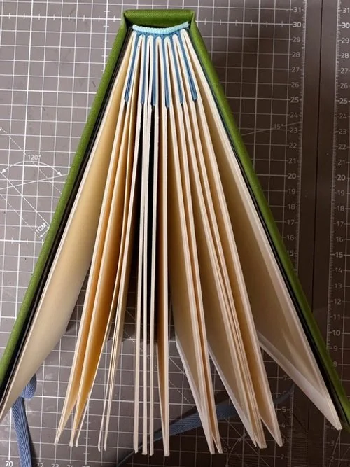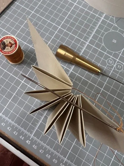 You will learn the essentials of paper grain, bone folding, punching, French link stitching, tipping-on end papers, gluing and backing and finally making the hard cover and casing in. We will be creating an accordion fold into which we will sew our album sections. This is to give you the extra depth required for an album. Once the book block is sewn and glued we will case into a hard cover and finally ‘tip on’ vellum paper on each page.