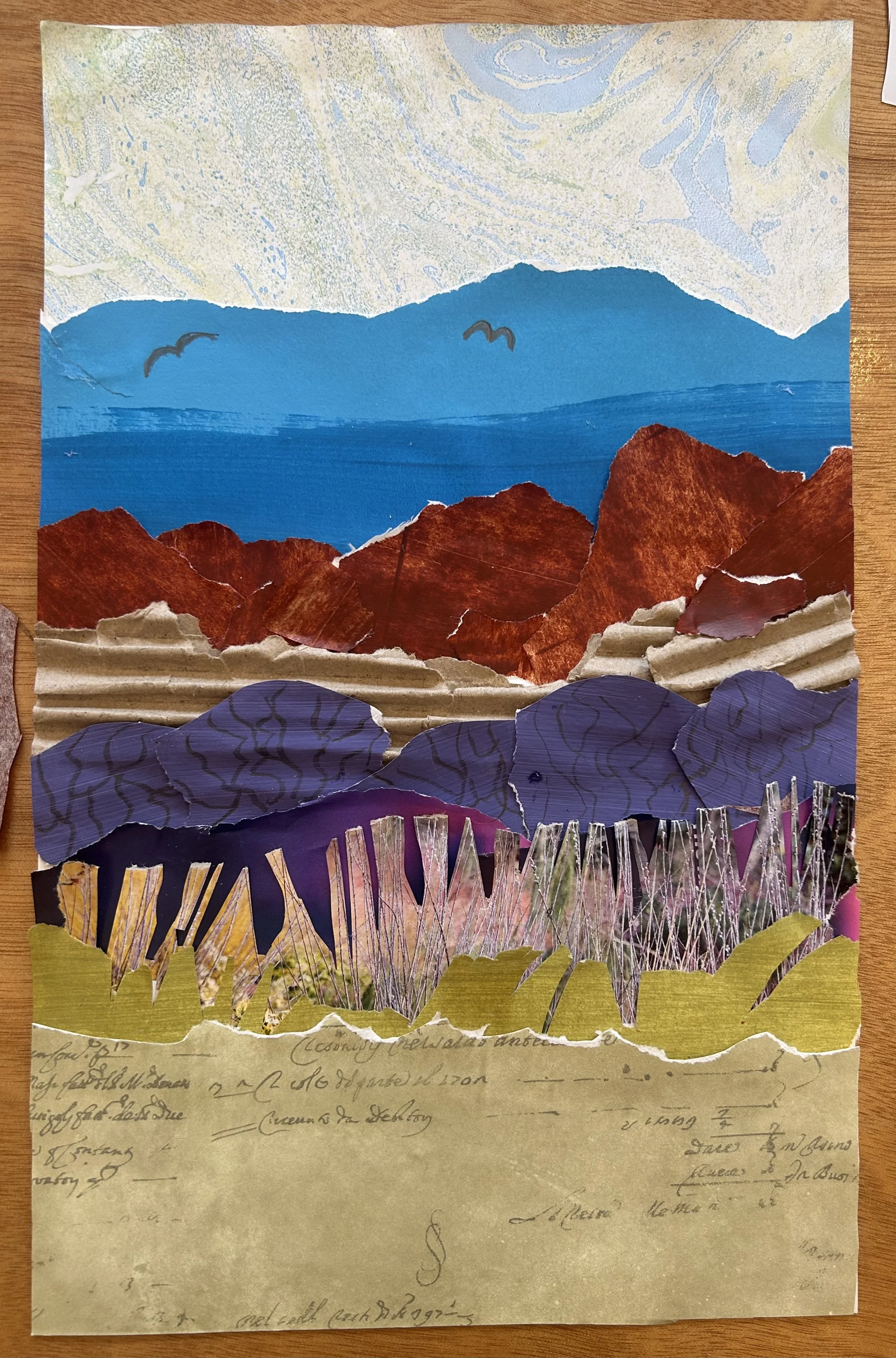 In this class I will provide a variety of hand painted, pre-loved, patterned, plain and found papers for you all to cut, tear, shape and stick to make a landscape – realistic, abstract, or somewhere in between. There will be plenty of images for inspiration.