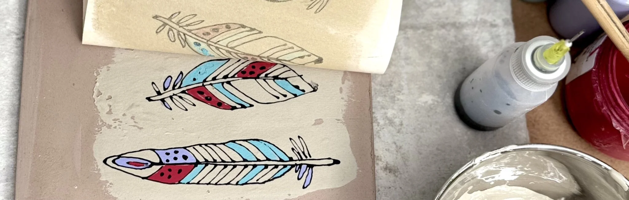 Using a variety of techniques, create unique designs with coloured slips and underglazes on newsprint paper